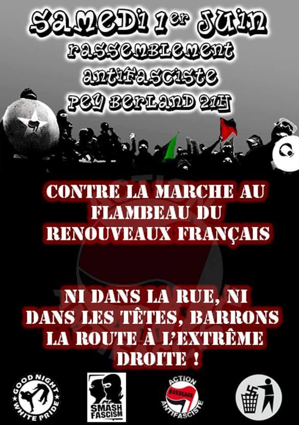 Le samedi 1er Juin, l’organisation nationaliste, Renouveau français, organise une marche aux flambeaux dans les rues de Bordeaux, afin de « rendre hommage à Jeanne d’Arc ». Mais ce défilé n’est pas du goût de quelques groupuscules d’extrême-gauche de Bordeaux, qui appellent à « barrer la route à l’extrême-droite ».