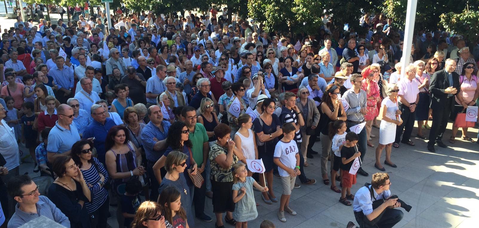 « Nous sommes ici pour faire entendre la voix de la France, la voix des Chrétiens d’Occident, qui veulent rappeler solennellement le droit des Chrétiens d’Orient à vivre en paix sur une terre qui constitue le berceau du Christianisme. Nous sommes ici pour dénoncer ce qui s’apparente, selon l’expression de Monseigneur Gollnisch, président de l’Oeuvre d’Orient, à « un génocide ». Depuis des semaines, les milices islamiques, dans une trop grande indifférence, persécutent les Chrétiens et les autres minorités : Humiliation, assassinat, viols, enlèvements, choix entre le départ, la mort ou la conversion à l’islam. Nous ne pouvons plus supporter de telles exactions. Notre silence s’apparenterait à de la complicité » a déclaré le porte parole du mouvement, en début de manifestation.
