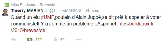 Le conseiller municipal bordelais de l’UMP, Edouard du Parc, a également fait part de son étonnement : « Une éventuelle alliance de la liste “Gironde positive”, dite union de droite, avec le parti communiste, au second tour des élections départementales, pour faire barrage au Front National, est-elle une initiative validée par la direction nationale de l’UMP? Ne serait-il pas plutôt préférable de rassembler un peu plus au sein de la droite républicaine et d’assumer ses valeurs de droite, afin d’éviter que ses propres électeurs ne partent à la concurrence, ou ne tombent dans l’abstentionnisme ? ».